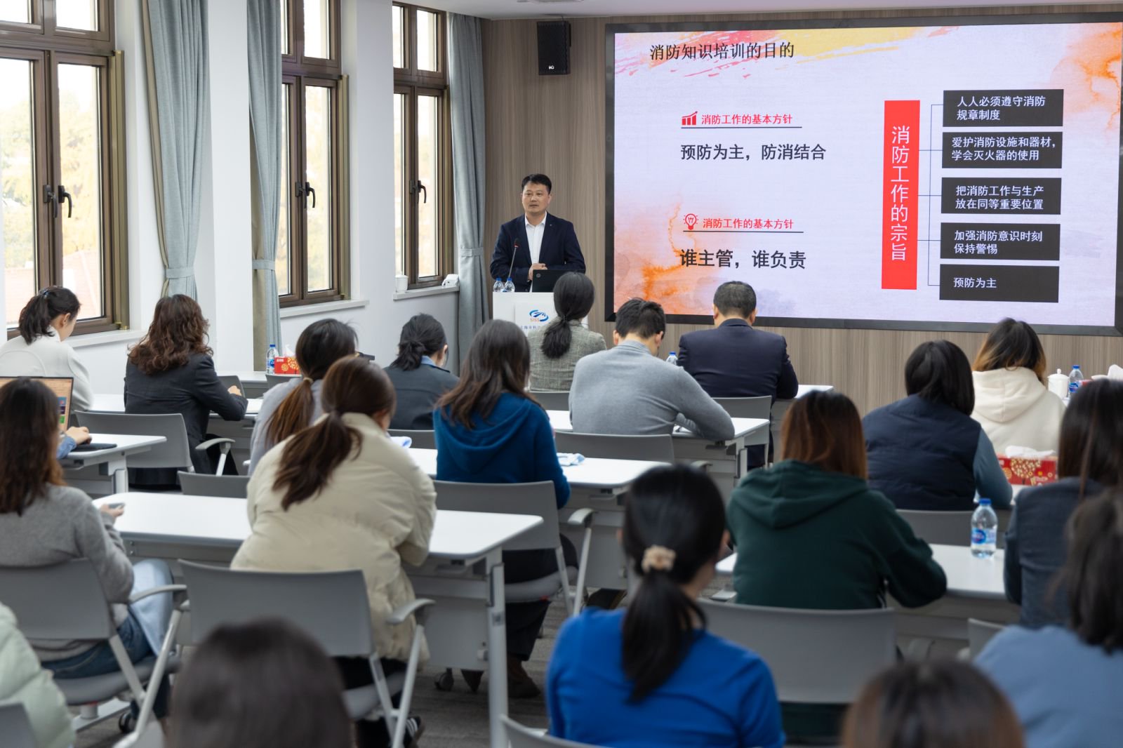 上海国信保安服务有限公司督导部的苏龙经理受邀进行理论知识培训,介绍了消防培训的重要意义和目的、火灾的起因和分类,以及预防火灾和火场自救逃生常识,主要聚焦火灾隐患排查、初期火灾扑救、人员疏散逃生做了重点讲解。