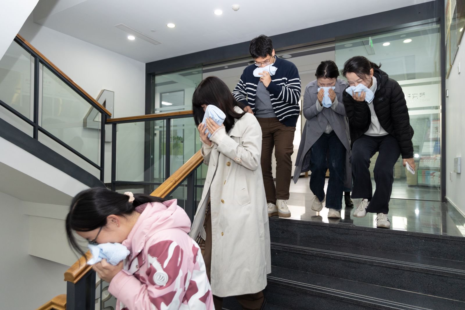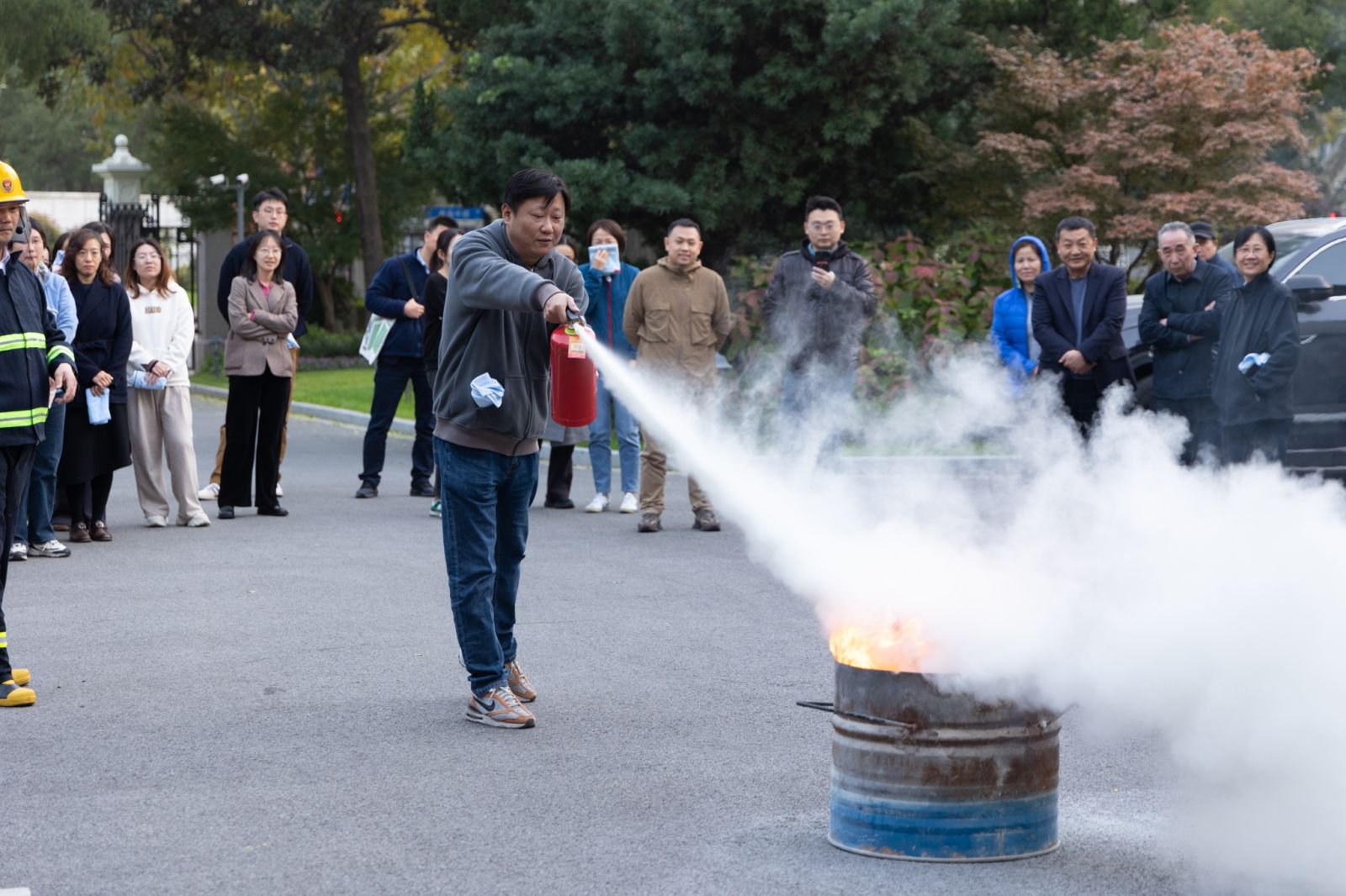 随后,大院职工开展了消防应急演练,随着消防警报响起,全体员工手持湿毛巾捂住口鼻,迅速有序地沿着安全通道完成了撤离。在大院空地,大家学习了灭火器的使用步骤,明确了灭火器的使用方法,部分员工代表进行了灭火实战演练。